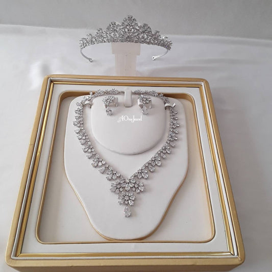 Indian Bridal CZ Diamond Cubic Zircon Necklace Earrings Tiara/Crown Jewelry Set