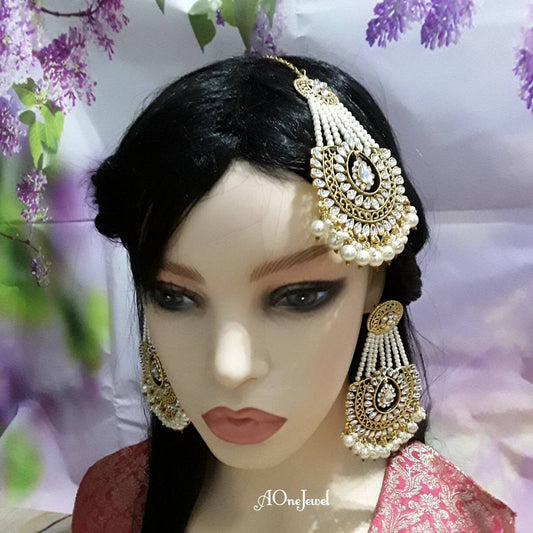 Indian Ethnic Kundan Pearl Necklace Set Tikka, Pearl Necklace Set, Wedding Jewelry Set, Pakistani Jewelry, Sabysachi Jewelry, Bridal Set