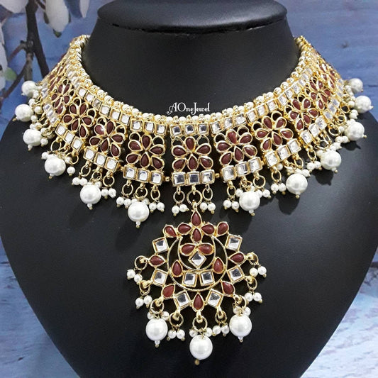 Indian Ethnic Kundan Pearl Maroon Colour Gold Plated Statement Necklace, Kundan Pearl Necklace, Wedding Necklace, Pakistani Jewellery