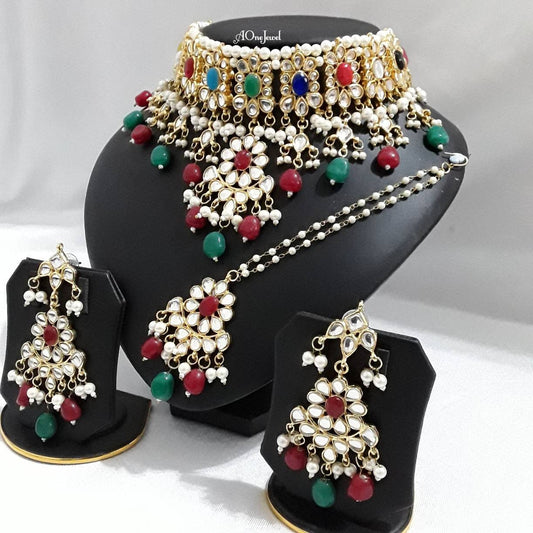 Indian Ethnic Kundan Pearl Gold Plated Choker Necklace Earrings Tikka, Pearl Necklace Set, Wedding Bridal Jewelry Set, Pakistani Jewellery