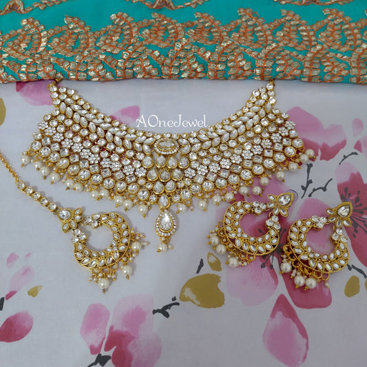 Indian Ethnic Kundan Pearl Gold Plated Choker Necklace Earrings Tikka Set, Pearl Necklace Set, Wedding Jewellery Set, Bridal Jewelry Set