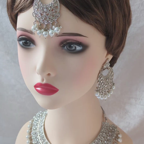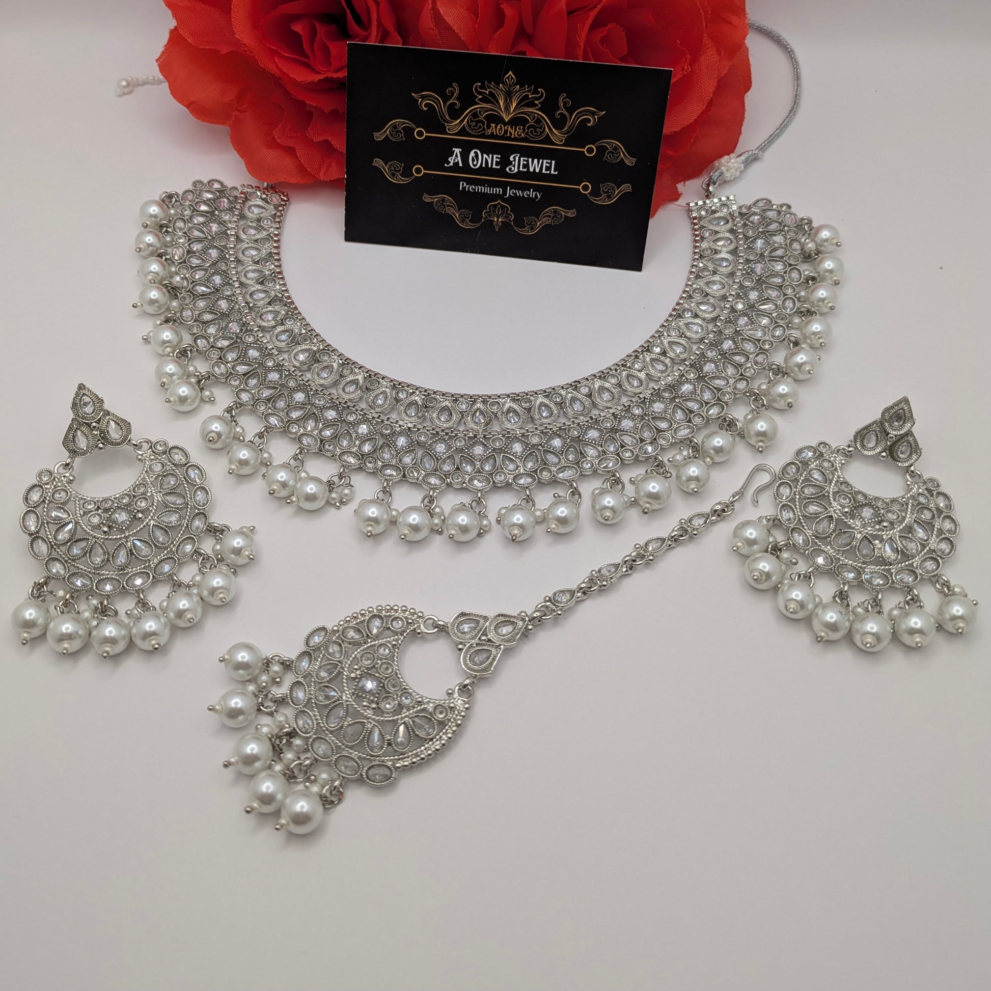 Indian Bridal Pearl Statement Necklace Jewellery Set, Silver Wedding Necklace Set