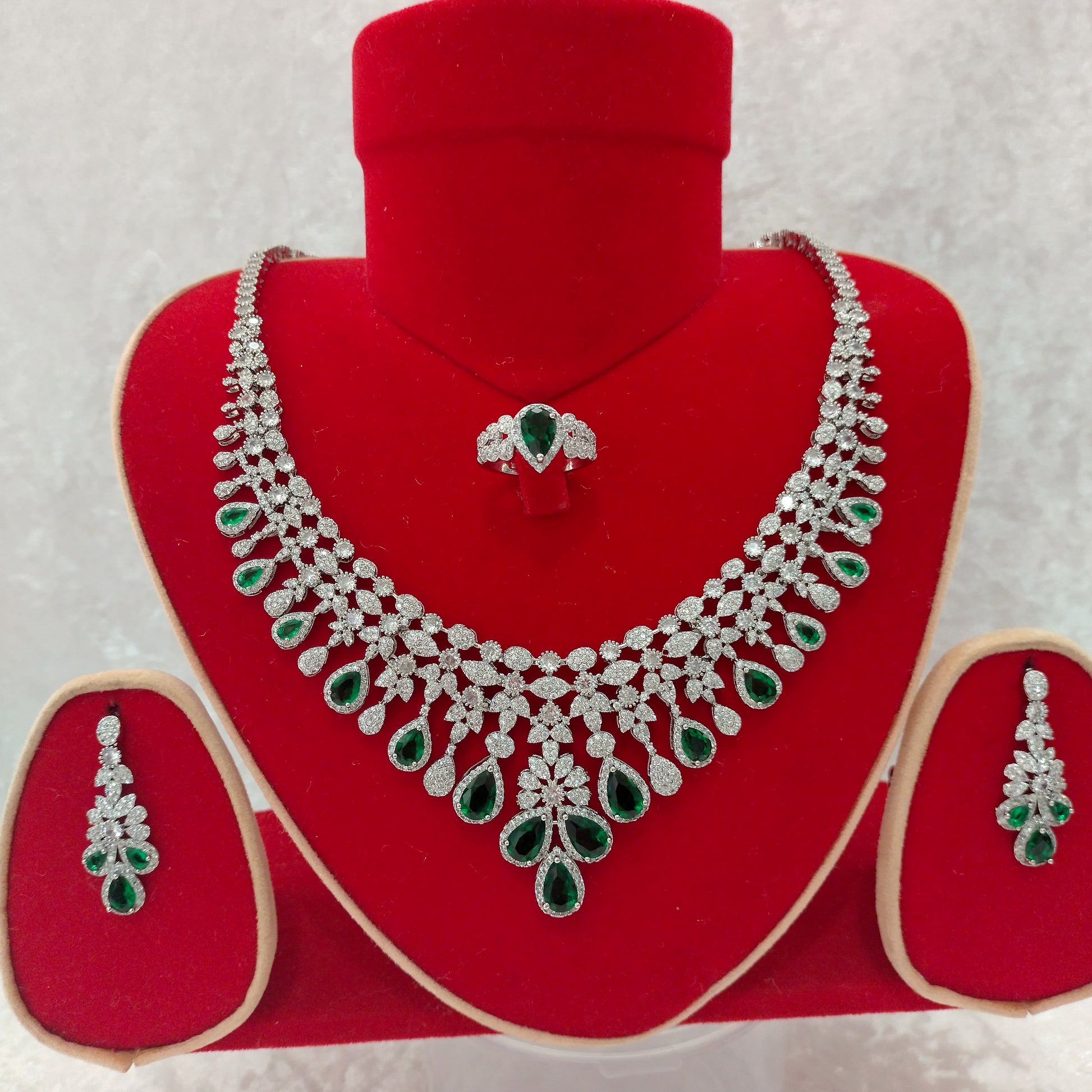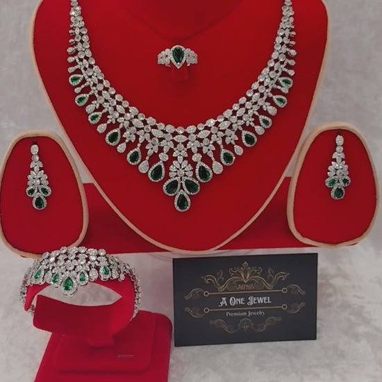 Luxury Indian Bridal CZ Diamond 4PCS Emerald Necklace Set